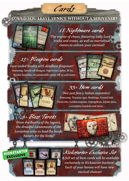 Nightmare cards are used in two ways: at the center of the card is portrayed a random event that will affect your day, while at the four corners there are boxes used for randomization. Item and weapons can be collected in two ways: by actively looking for them during the day or by killing a Boss. Items and weapons can be persistent bonuses or just one shot items, some will affect the day, while others will help you during the night. All of them can be sacrificed to save you from an attack. Boss tarots are used to discover the dreadful enemies you’ll face at night and to remind you of those you could not kill, because they will hunt you every night after.