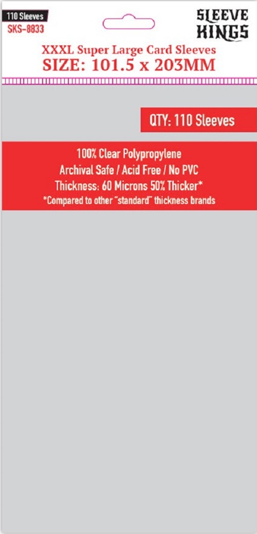Sleeve Kings card sleeves Size: 101 x 203 mm Thickness: 60 microns Quantity: 110 sleeves per pack Type: 100% clear polypropylene, acid free, no PVC