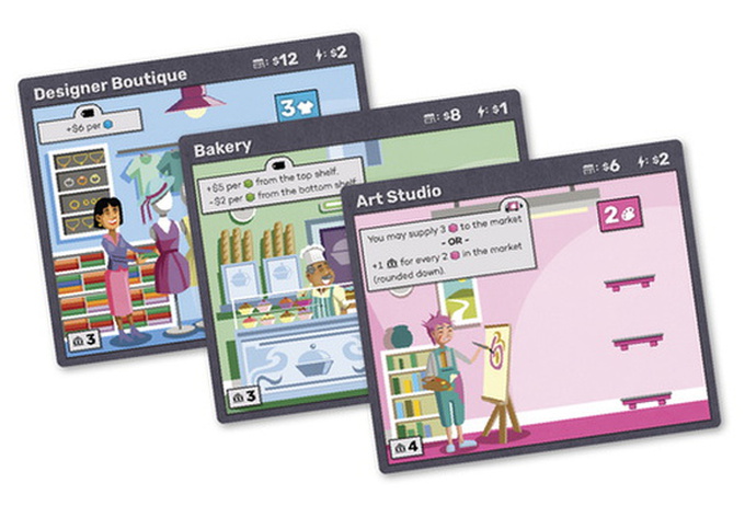Each round, players simultaneously determine the market, speculate on resources, sell what they can, invest in victory points, and manage their storefronts. Each new store in a player’s building provides unique benefits and restrictions. In the end, the player with the greatest investment in both stores and points wins!