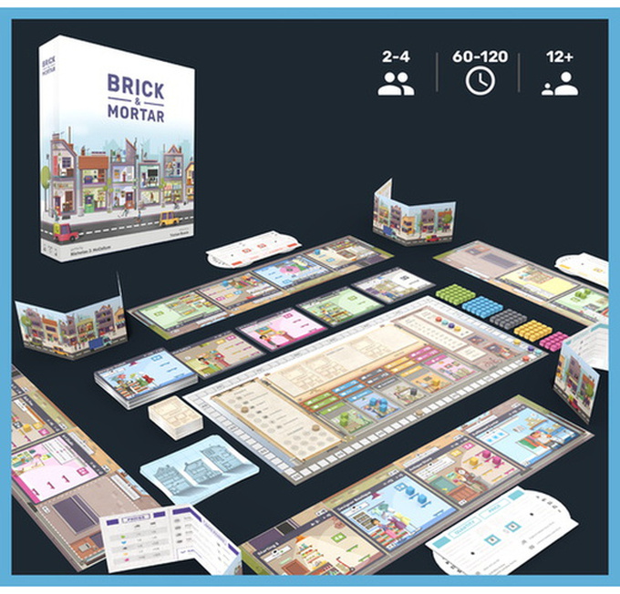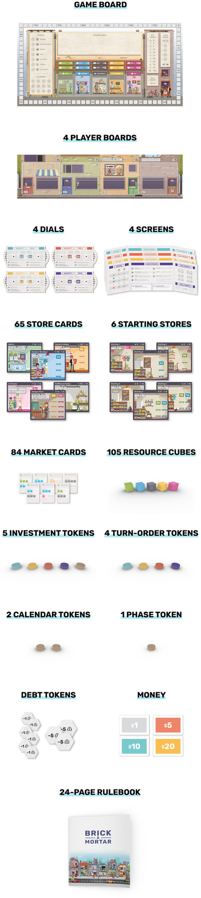 Brick & Mortar is a competitive game of narrow margins, quirky stores, and strategic market manipulation. Over a series of rounds, two to four players manage a collection of stores trying to maximize profits, build equity, and undercut the competition amid a fickle market that can change at the whim of their opponents. A game of narrow margins, quirky stores, and strategic market manipulation.