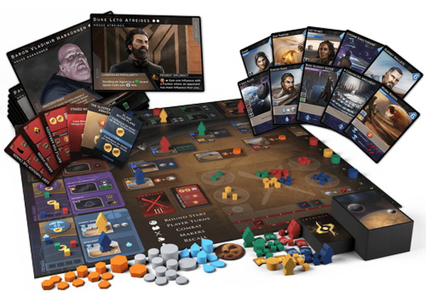You start with a unique leader card, as well as deck identical to those of your opponents. As you acquire cards and build your deck, your choices will define your strengths and weaknesses. Cards allow you to send your Agents to certain spaces on the game board, so how your deck evolves affects your strategy. You might become more powerful militarily, able to deploy more troops than your opponents. Or you might acquire cards that give you an edge with the four political factions represented in the game: the Emperor, the Spacing Guild, the Bene Gesserit, and the Fremen.