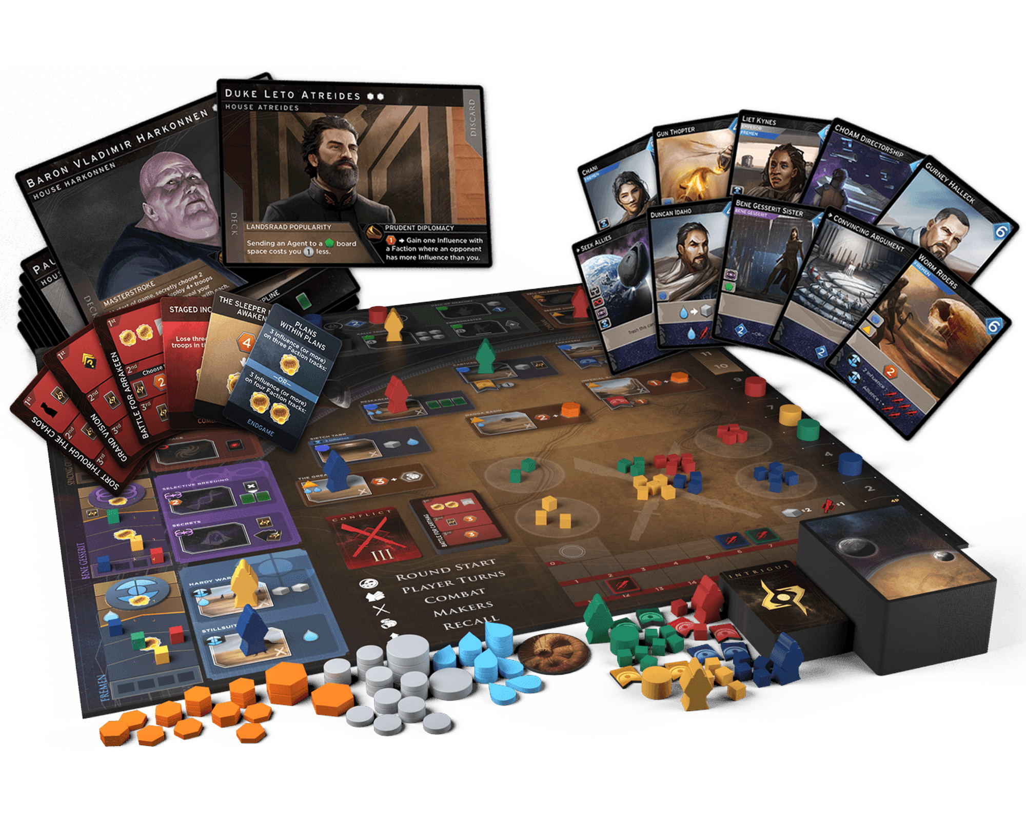 Dune: Imperium is a game that finds inspiration in elements and characters from the Dune legacy, both the new film from Legendary Pictures and the seminal literary series from Frank Herbert, Brian Herbert, and Kevin J. Anderson. As a leader of one of the Great Houses of the Landsraad, raise your banner and marshal your forces and spies. War is coming, and at the center of the conflict is Arrakis – Dune, the desert planet.