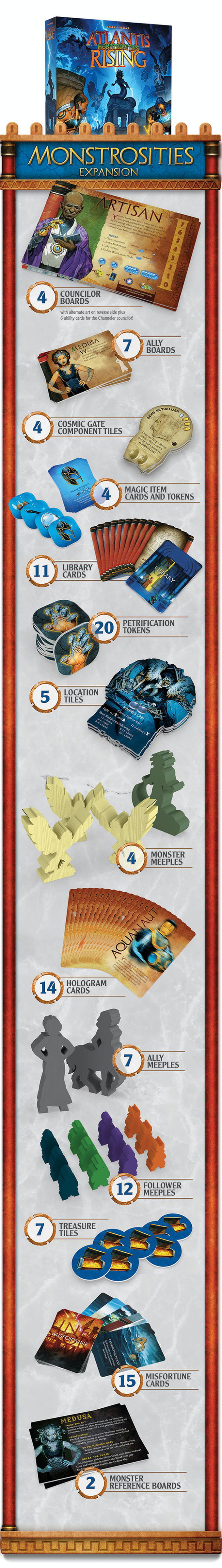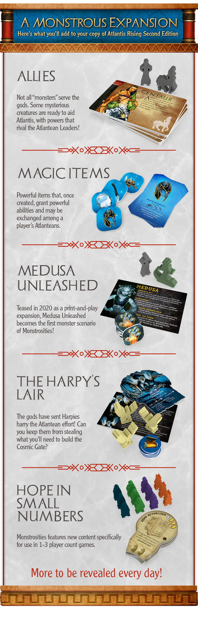 Atlantis Rising: Monstrosities is an expansion for Atlantis Rising (Second Edition) that offers these new challenges: Medusa Unleashed, The Harpies's Lair, etc