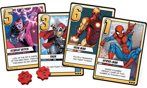 Throughout the game, players take turns drawing a card and playing a card, then executing its effect. Hero players can call upon the likes of Iron Man, Spider-man, Thor, and Scarlet Witch for their abilities to battle and gather intel about their opponent’s schemes. A worthy adversary, Thanos plays with a two-card hand, drawing from his own deck of minions and powerful Infinity Stones. The heroes will have to use their abilities in strategic combinations to knock his health down to zero before he can do the same to them—or find all six Infinity Stones and win with a snap of his fingers. Who will prevail in this battle for the universe?