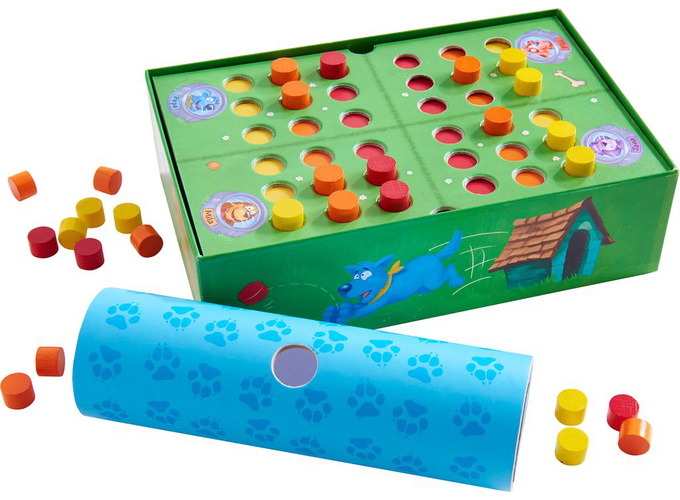 - Now take the treats you collected and sort them into the matching colored holes in your lawn section on the board.