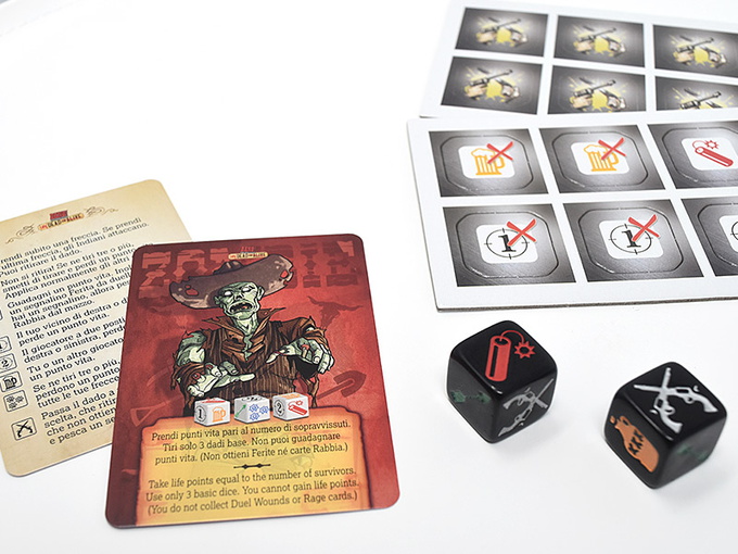 The new dice also feature another new symbol: the whiskey bottle. If you roll a whiskey bottle during your turn and you have no duel wound tokens to discard or if you lose two or more life points in one turn, you must draw a rage card; the symbols on those cards are added to the results of the dice!
