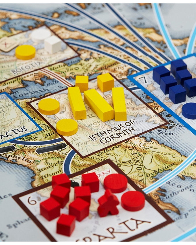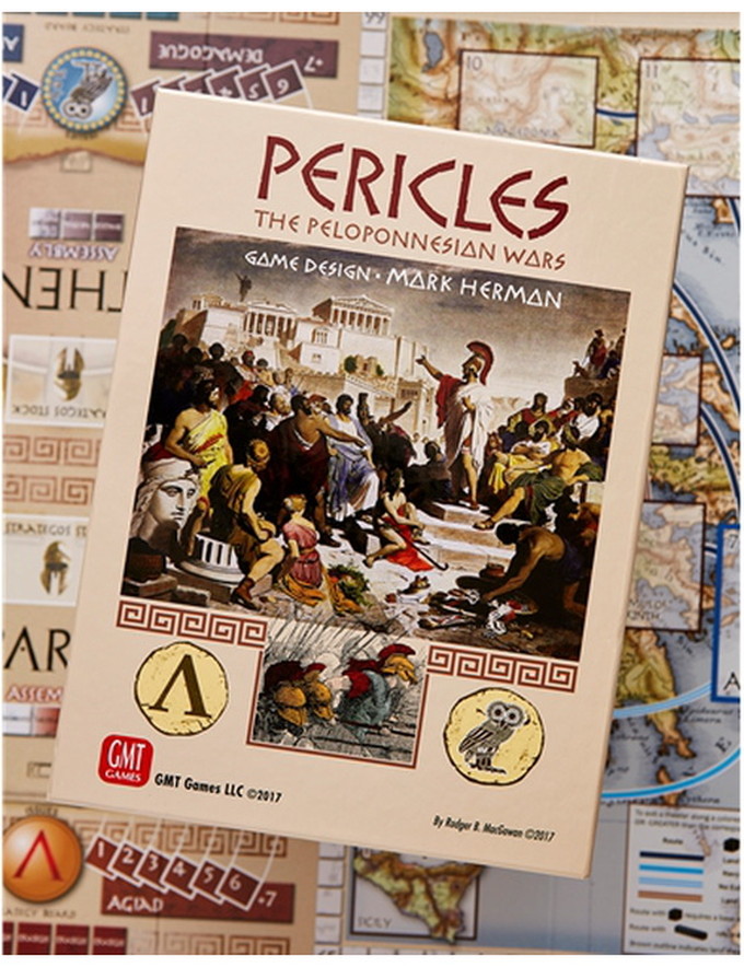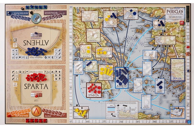 Pericles is a four player 'sandbox' design that covers the period from 460 BC to 400 BC. The players each represent one of two Athenian or Spartan factions. The game has a political and a war phase. During the war phase the players are US versus THEM. During the Political Phase it is ME versus YOU (Athenian faction versus Athenian faction and Spartan king versus Spartan king).