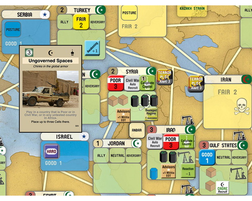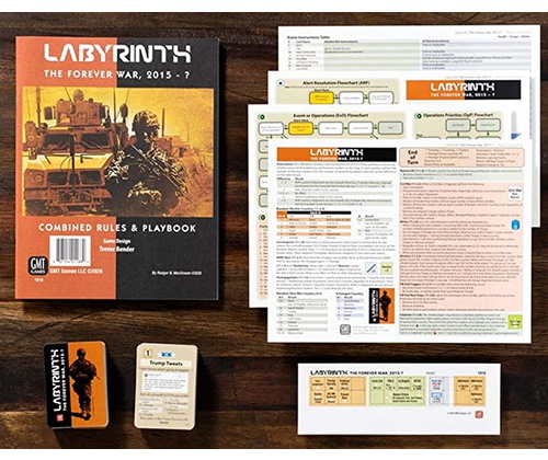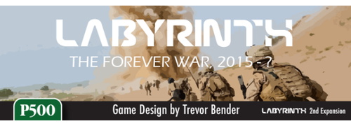 Labyrinth: The Forever War, 2015 - ? is a 1-2 player card-driven boardgame simulating at the strategic level the ongoing bid by Islamist extremists to impose their brand of religious rule on the Muslim world. It continues where Labyrinth: The Awakening, 2010 - ? left off and adds new event cards and rules to cover the last five years of history.