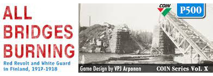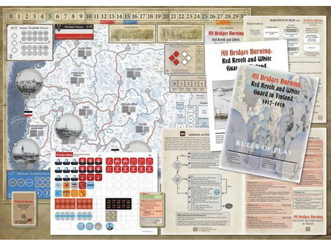 All Bridges Burning recreates the political and military affairs of the Finnish civil war in a new COIN System volume for three players. The Reds seek to stage a working class revolt and then hold onto their gains, while the White Senate forces seek to reassert control. A third, non-violent Social Democratic faction fights for the survival of moderate leftism and political reform. All three factions must keep the national sentiment conciliatory enough for a post-conflict settlement and national independence. In addition, the non-player powers of Germany and Russia offer military assistance to the Senate and the Reds, respectively. Excessive foreign involvement, however, could quash the dream of Finnish independence and prompt a collective loss of all three player factions. Historical events, asymmetrical action menus, as well as extensive historical design notes familiarize the players with the historical period.