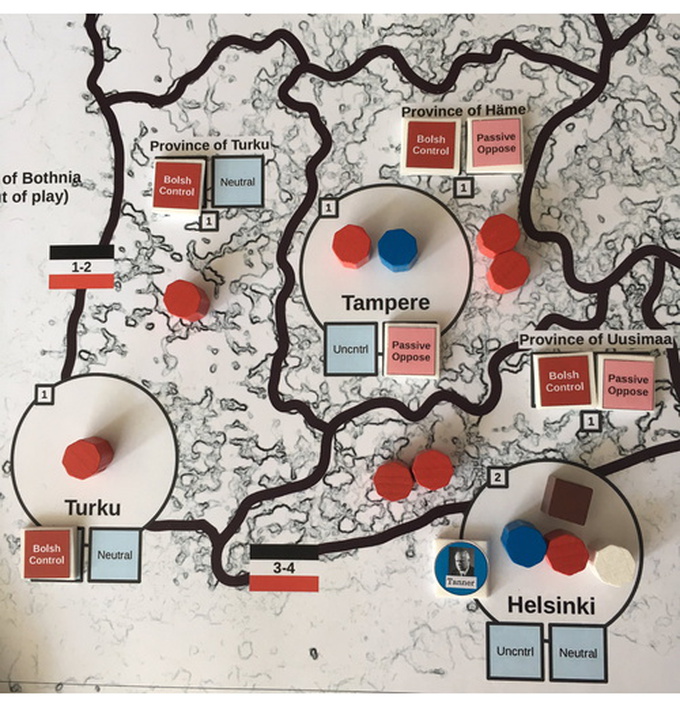 A unique sequence of play for three factions poses players – whether veteran or new to the COIN Series – fresh challenges in selecting from the asymmetric commands and special activities. The Reds will find themselves needing to split time and resources between competing tasks of solidifying the Red revolt by creating working organs of civilian administration on the one hand, and fighting an increasingly desperate war against a far more powerful enemy on the other. The White Senate faction, in contrast, has a more traditional war to fight. The Senate will want to enhance their military performance by capabilities such as armored trains, cannons, as well as the Finnish, German-trained 27th Jaeger Battalion. Meanwhile the Social Democrats will be focused on building and maintaining underground networks of information, distributing news across the fronts, and advancing a stagnating political process while fending off retributions from the two warring factions.