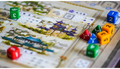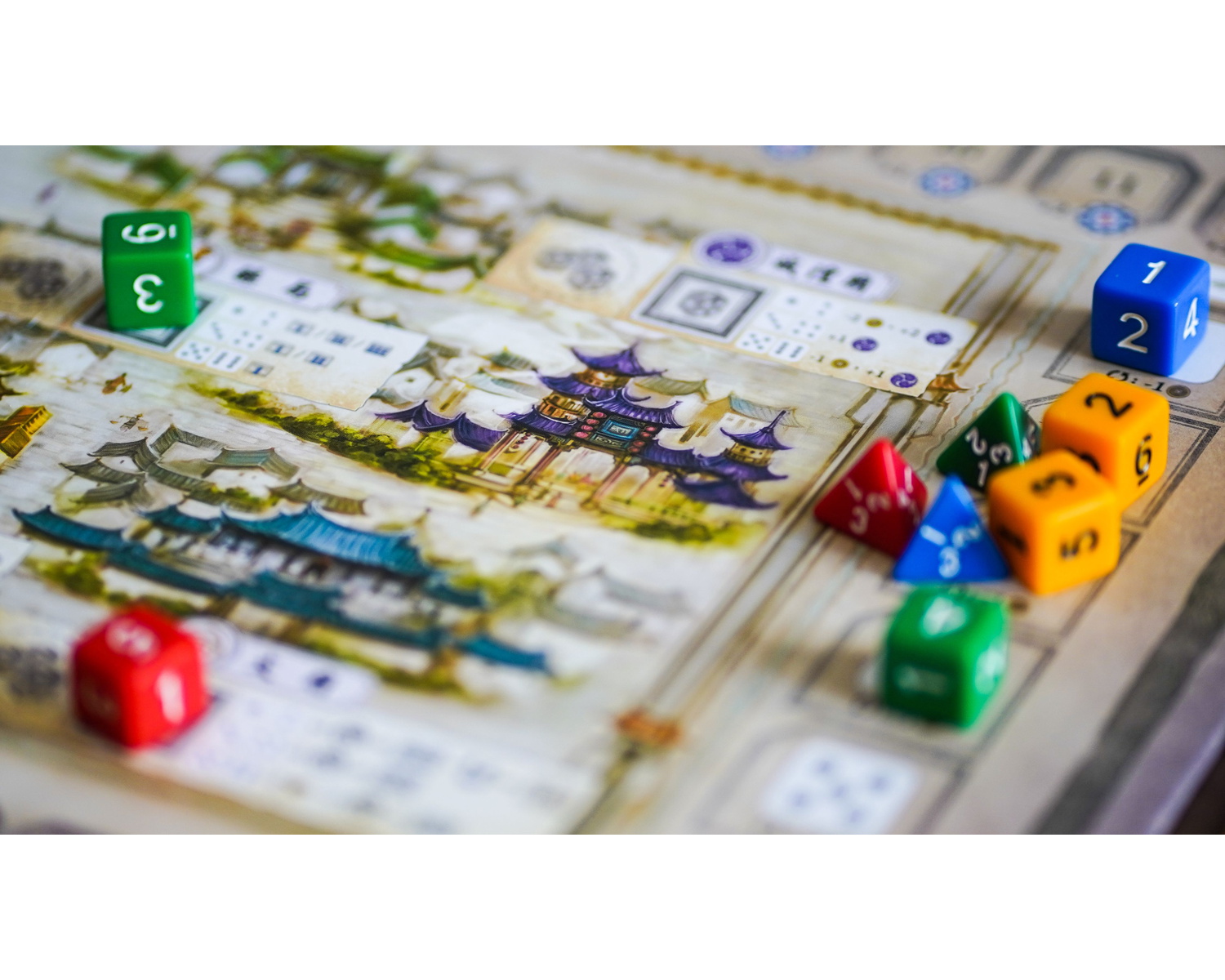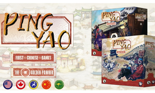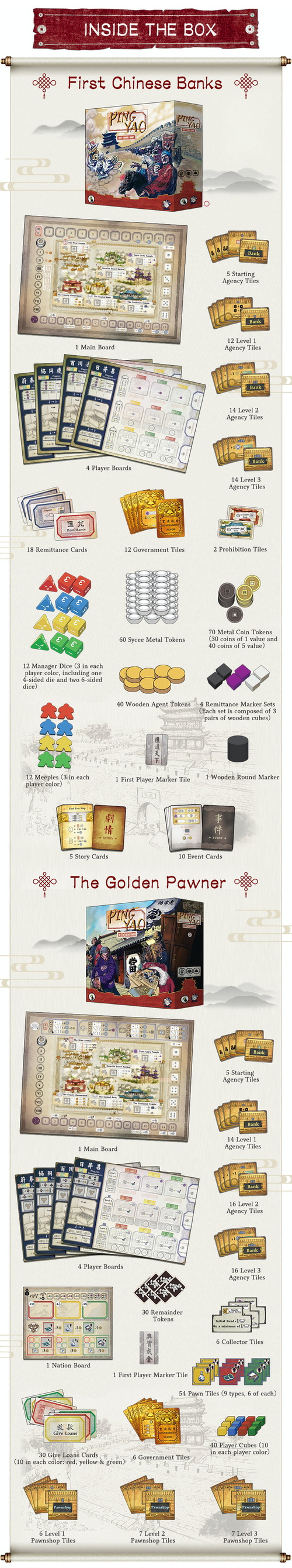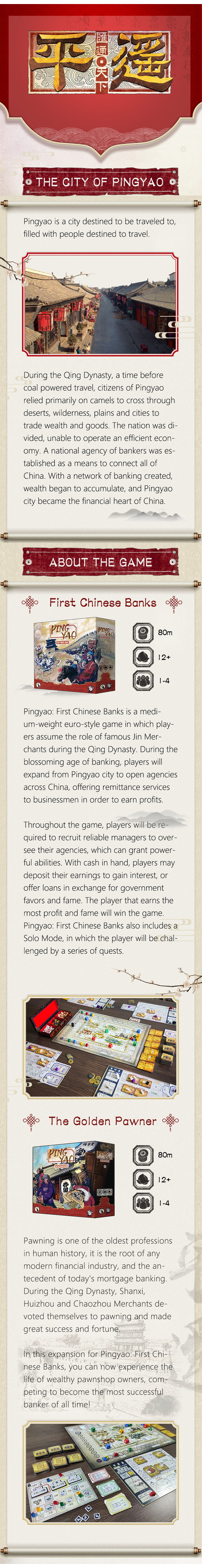 Pingyao: First Chinese Banks is an economic dice-as-workers placement game in which players assume the role of famous Jin Merchants in the Qing Dynasty. During the blossoming age of banking, players will expand from Pingyao city to open agencies across China, offering remittance services to businessmen in order to earn profits. The goal of the game is to build up money over 8 rounds, and be the wealthiest player by the end.