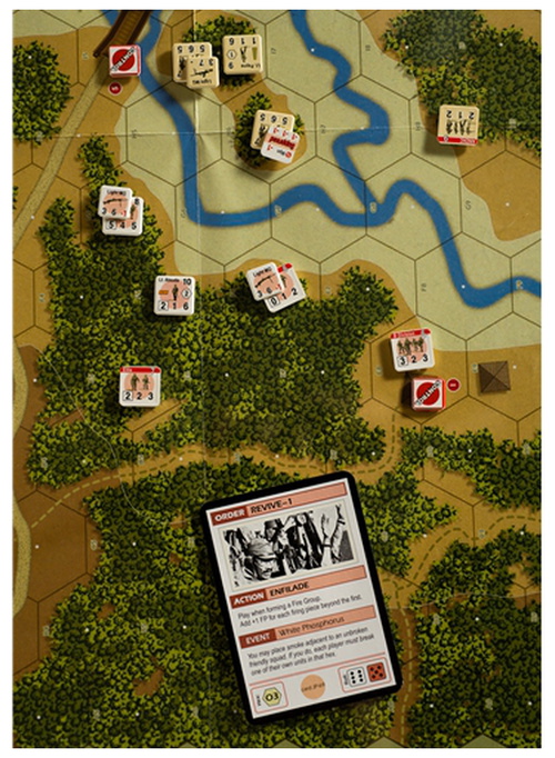 VICTORY: Players attempt to achieve victory by moving their combat units across the game map to attack their opponent’s combat units and occupy as many objectives as possible. The degree to which a player succeeds or fails is measured by a scenario’s specific Objective chits, the destruction of enemy units, and the exiting of friendly units off the opponent’s board edge.