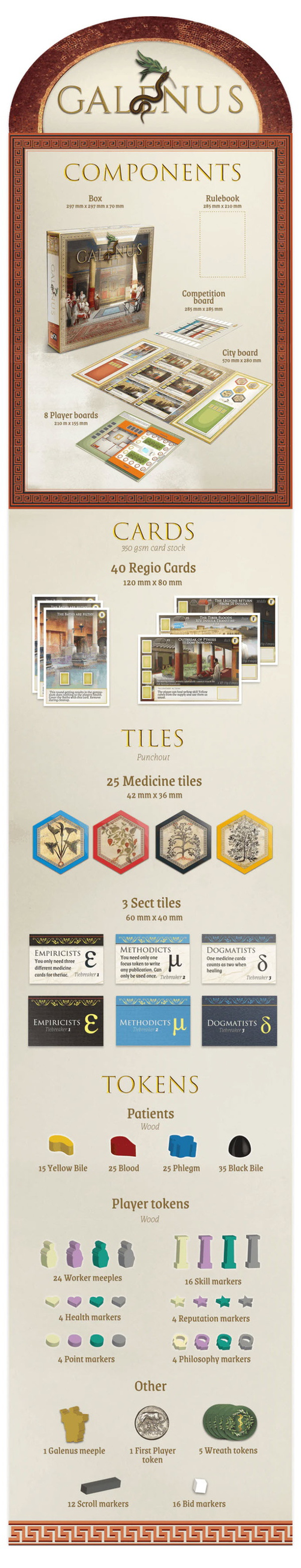 Medicine in Imperial Rome is an art of celebrated advances, an art of showmanship and bitter rivalry between practitioners all with their own entourages. There is one doctor above all others: Galenus. The writings of this second century Greco-Roman would be the epitome of medicine for one thousand years to come. The players enter this arena as doctors starting out by studying, treating patients, accumulating reputation and competing against each other in showy demonstrations. The goal of the game is to be the best young doctor, primus inter pares, by collecting the most favor in the eyes of Galenus over five rounds and thus becoming his friend and student. Galenus looms over everything the players do, and he will crush all who dare challenge him.