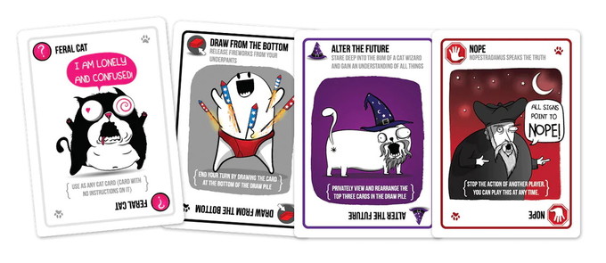 Exploding Kittens is a kitty-powered version of Russian Roulette. Players take turns drawing cards until someone draws an exploding kitten and loses the game. The deck is made up of cards that let you avoid exploding by peeking at cards before you draw, forcing your opponent to draw multiple cards, or shuffling the deck.