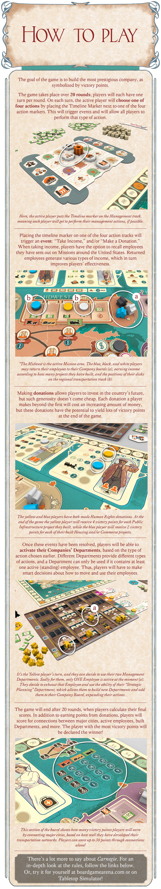 The goal of the game is to build the most prestigious company, as symbolized by victory points.