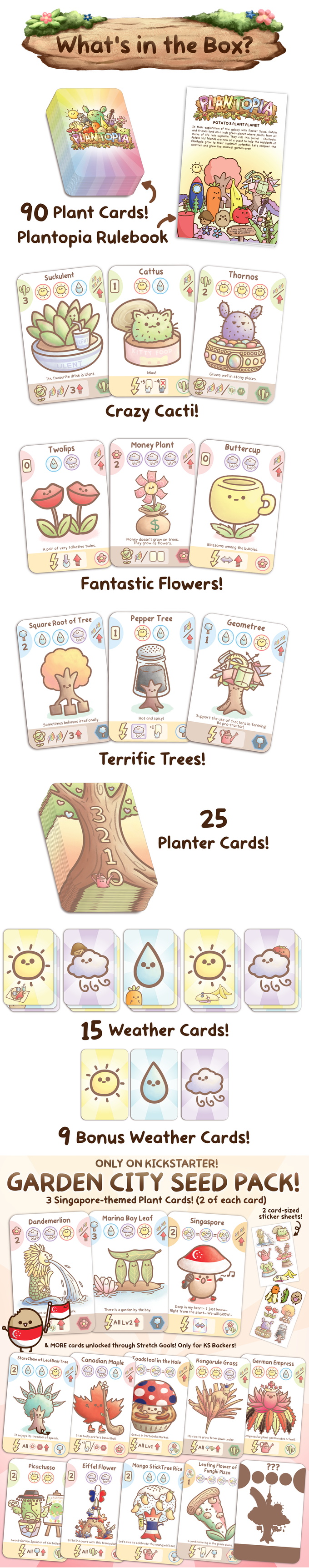 Plantopia is a strategy card-based game where players harness their gardening abilities to contend for the coveted title of Plantopia’s Champion Gardener. Manage the plants in your hand and in your tableau and plant the best combos to earn the most magical leaves. But pay attention to all of your fellow gardeners, as whoever can predict the weather can make their plants grow!