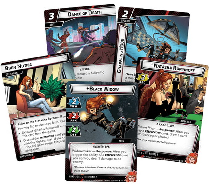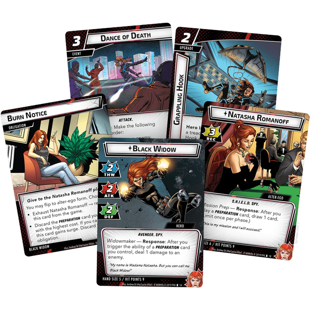 The Black Widow Hero Pack includes a pre-built deck for Black Widow utilizing the Justice aspect, the Taskmaster nemesis set, and additional cards to help increase your deck building options! With well-rounded base stats and a Preparation card for every occasion, Black Widow is always ready for what’s coming next!