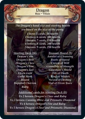 Boss decks include 30 cards - 18 starting deck cards, 9 Treasure Hoard cards, 2 score cards, and the Dragon boss card. Each boss is unique, having different numbers of cards in their starting decks, different ability cards, and even brand new card types.