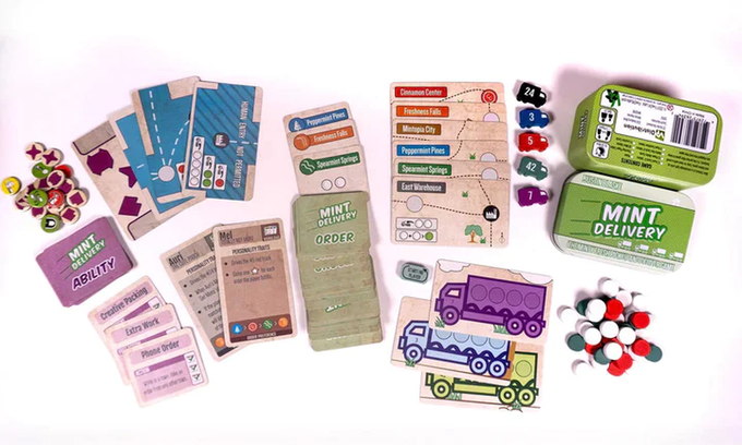 Mint Delivery is a mint tin-sized, pick-up-and-deliver board game designed to be quick-to-play and easy-to-learn.
