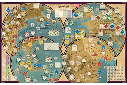 Imperial Struggle covers almost 100 years of history and four major wars. Yet it remains a low-complexity game, playable in a short evening. It aims to honor its spiritual ancestor, Twilight Struggle, by pushing further in the direction of simple rules and playable systems, while maintaining global scope and historical sweep in the scope of a single evening. In peace turns, players build their economic interests and alliances, and take advantage of historical events represented by Event cards. They must choose their investments wisely, but also with an eye to denying these opportunities to their opponent. In war turns, each theater can bring great rewards of conquest and prestige, but territorial gains can disappear at the treaty table. At the end of the century, will the British rule an empire on which the sun never sets? Or will France light the way for the world, as the superpower of the Sun King's dreams or the republic of Lafayette's?