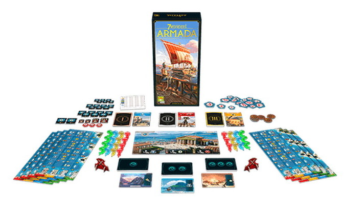 The horizon is now within reach, your armada waits only on you to go conquer the seas! On board your ships, discover faraway isles, trade with remote cities, and equip your fleets to prepare for the naval conflict to come… In addition to a new Wonder, this expansion allows you to expand your interactions with two new types of cards: Armada cards and Isle cards. Navigators, explorers, shipowners, and pirates will give new depth to your games.