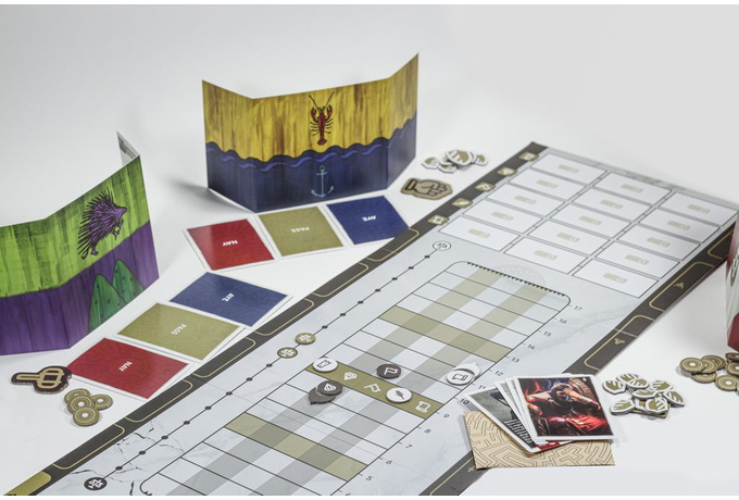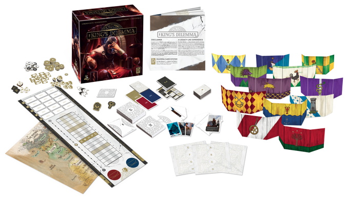 The King's Dilemma is an interactive narrative experience with legacy elements, featuring several branching storylines leading to many possible finales and an evolving deck of event cards at its core. Players represent the various houses leading the government of the Kingdom of Ankist.