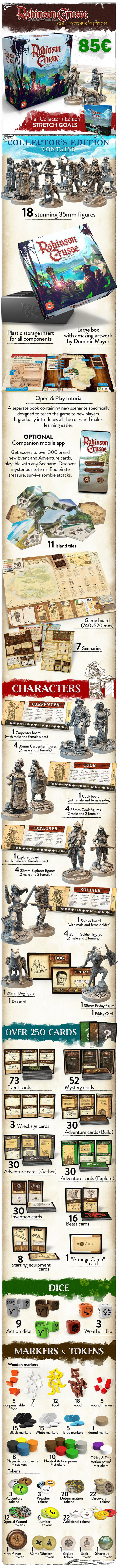 This is the Kickstarter Robinson Crusoe: Collector’s Edition with amazing miniatures crafted by Awaken Realms, tutorial campaign, and companion app, with several dozen scenarios labeled by their length, difficulty, and theme to help you find a perfect one for the gamenight.