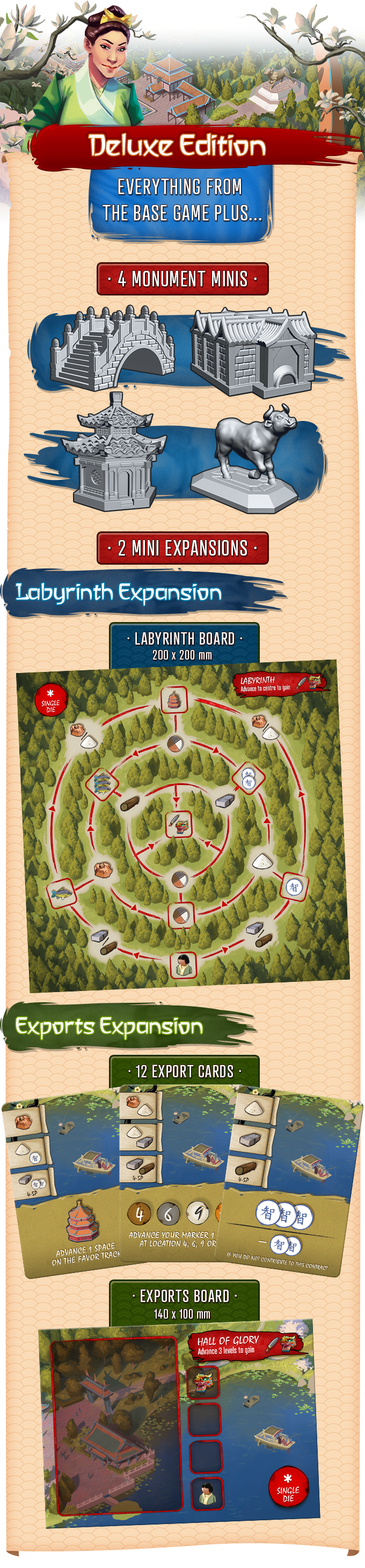 The Labyrinth and Exports expansions are only included in the deluxe edition of Eternal Palace. The Composition expansion is included in the Kickstarter pack (free to all Kickstarter backers)