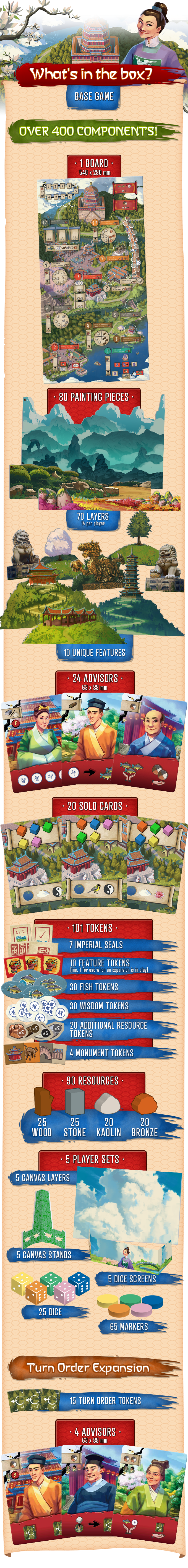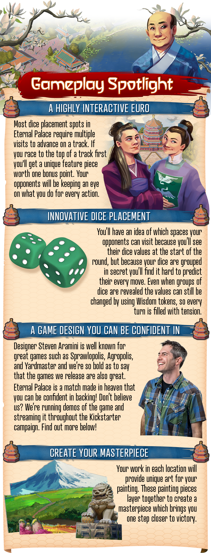 Gaining points has never been so beautiful. Each painting layer you gather in Eternal Palace is layered onto your canvas to create a unique painting, which scores you points at the end of the game. If you win one of the race tracks, you’ll gain a unique feature piece and a bonus point.