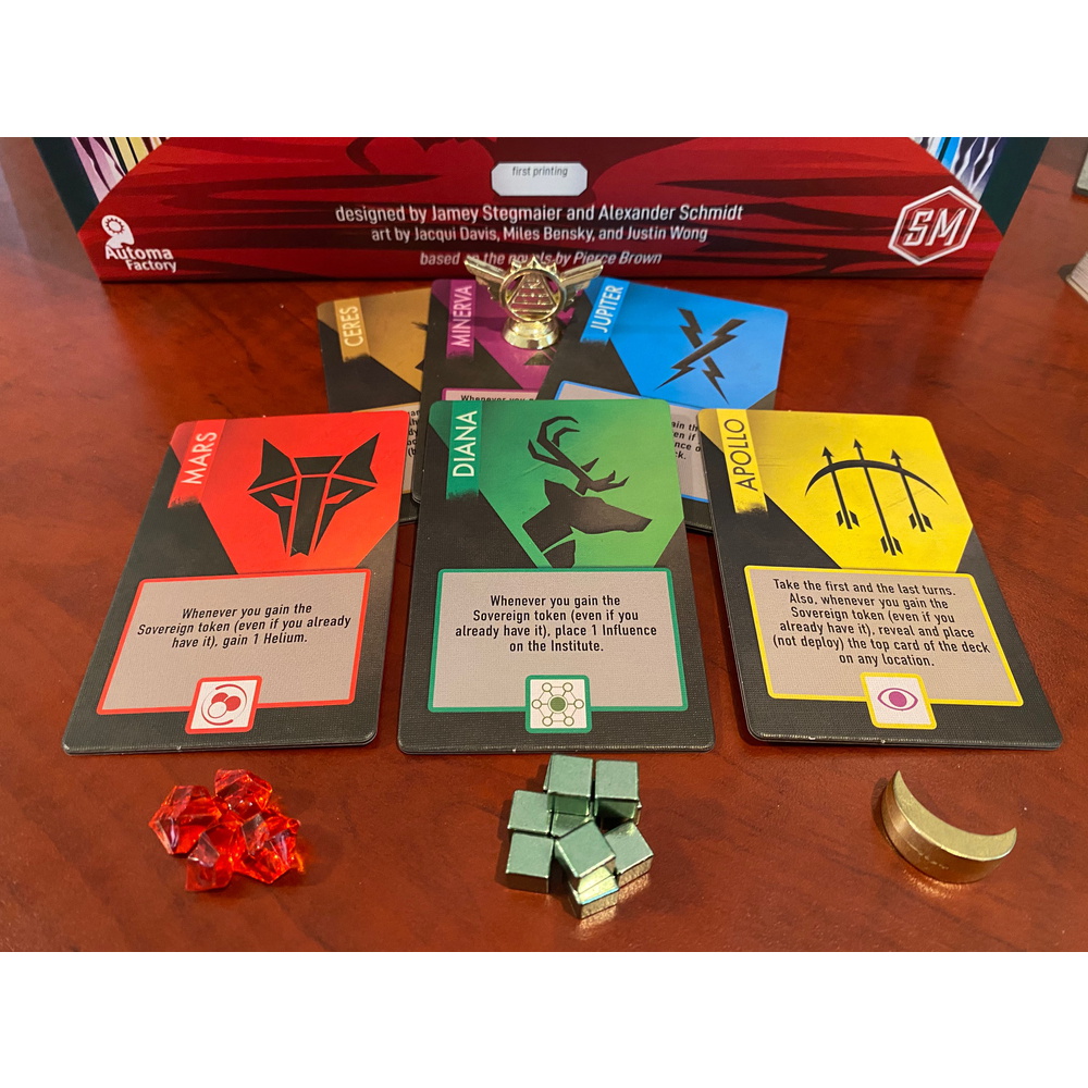 Enter the futuristic universe of Red Rising, based on the book series by Pierce Brown featuring a dystopian society divided into fourteen castes. You represent a house attempting to rise to power as you piece together an assortment of followers (represented by your hand of cards). Will you break the chains of the Society or embrace the dominance of the Golds?