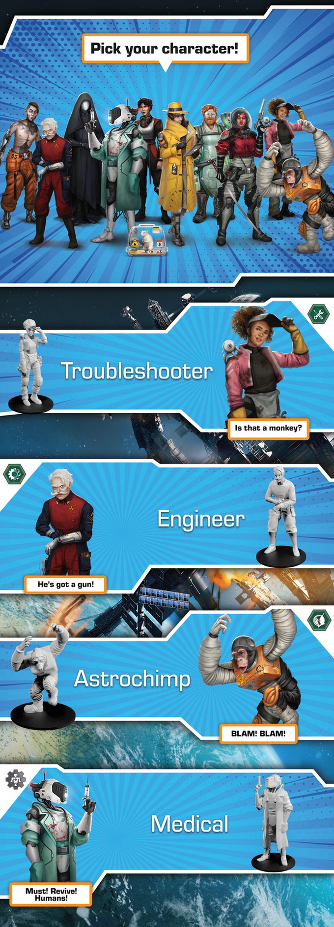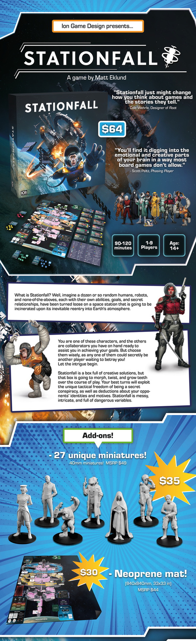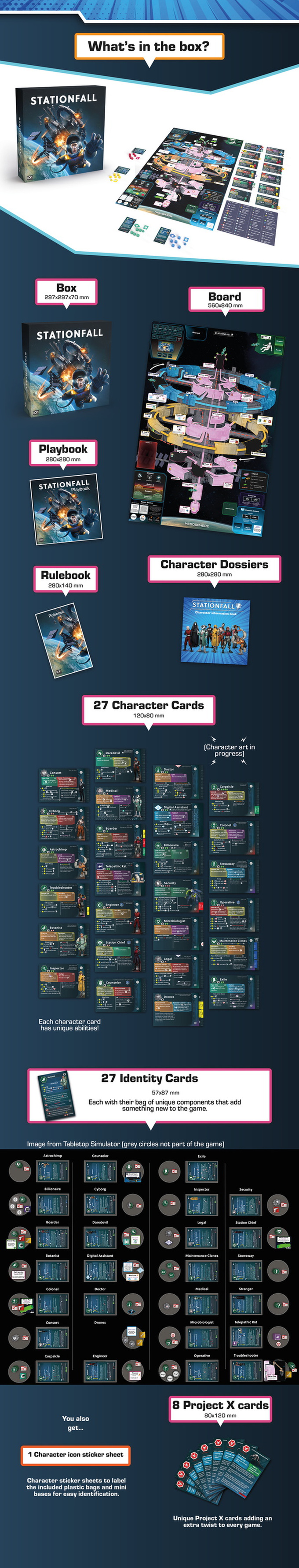 Stationfall is a box full of creative solutions, but that box is going to morph, twist, and grow teeth over the course of play. Your best turns will exploit the unique tactical freedom of being a secret conspiracy, as well as deductions about your opponents’ identities and motives. Stationfall is messy, intricate, and full of dangerous variables.