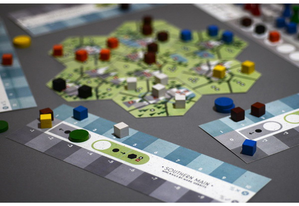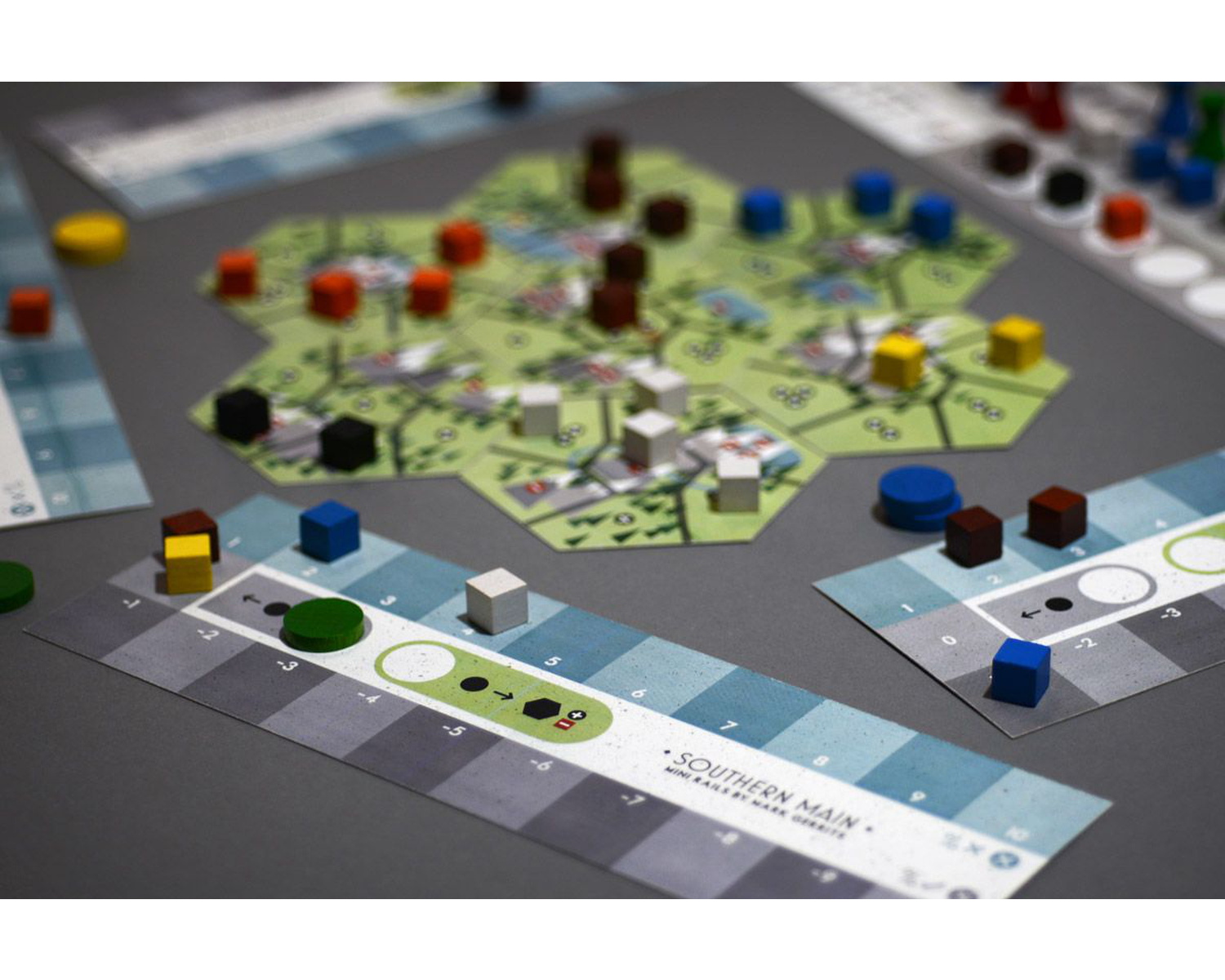 The game includes only two types of actions — "Buy Shares" and "Build Tracks" — and you must carefully decide how to best use them. You must do each action exactly once per round, and which company you choose affects the turn order on the next round.
