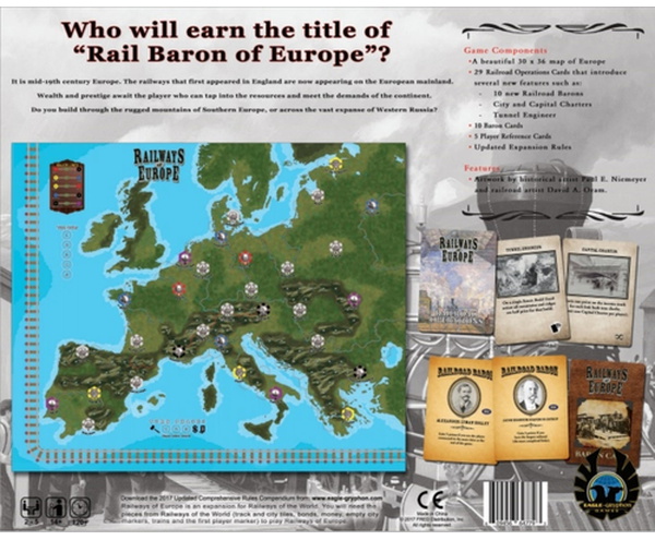 A continent awaits for the Railways of Europe. Railways of Europe is an expansion map for Eagle Game's very popular railroad game. You will need the pieces from the basic game (track and city tiles, shares, money, empty city markers, trains and first player marker) to play Railways of Europe.