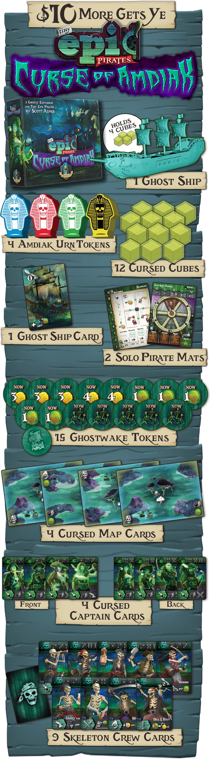 In Tiny Epic Pirates: Curse of Amdiak, rumors of the unthinkable are spreading quickly around the islands. Rumors of dead pirates returning to the sea... aboard an ominous ghost ship helmed by the legendary pirate Amdiak...