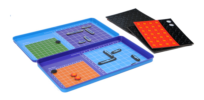 BATTLESHIP was originally a pencil-and-paper public domain game known by different names, but Milton Bradley made it into the well known board game in 1967. The pencil and paper grids were changed to plastic grids with holes that could hold plastic pegs used to record the guesses.