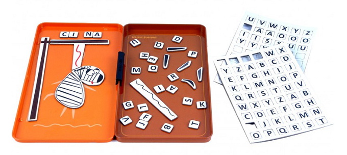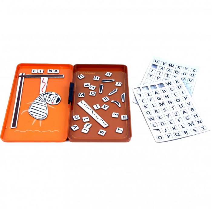 HANGMAN. This is the classic letter guessing game with plastic cases to place letters in and to indicate how close the opponent is to being hung.