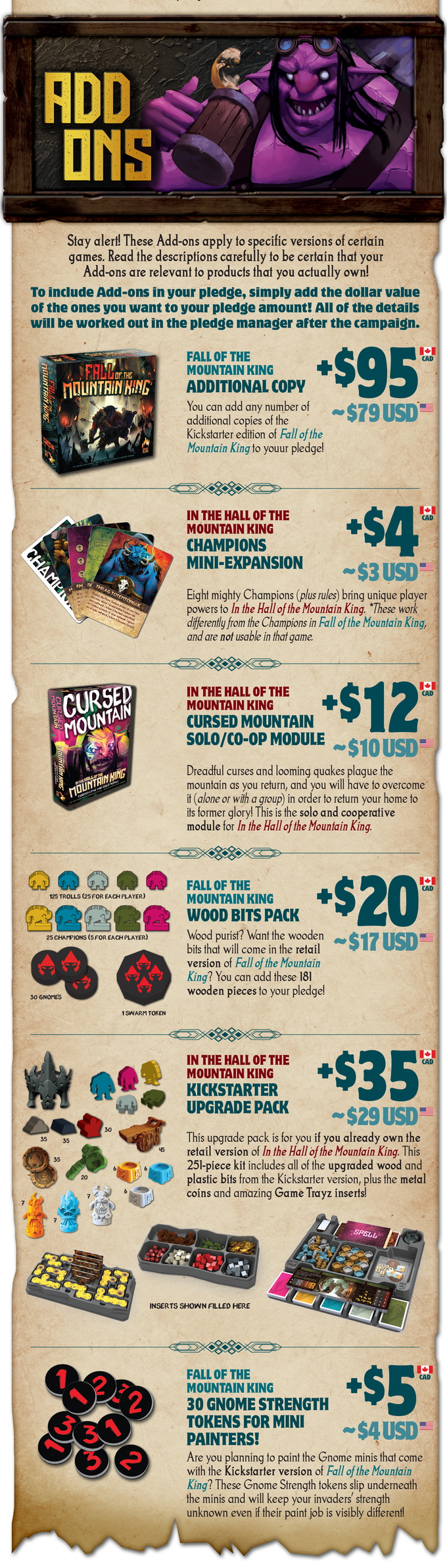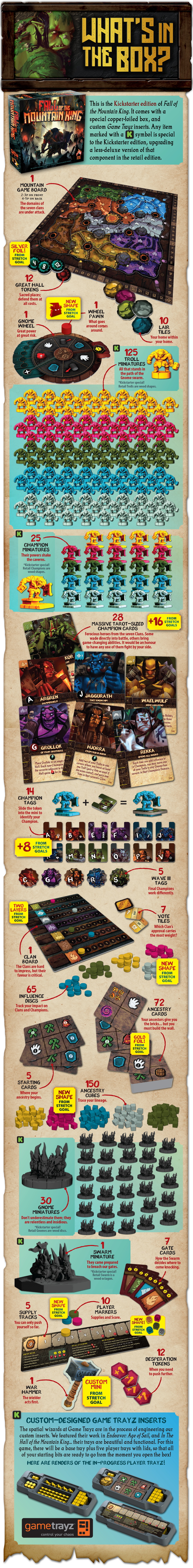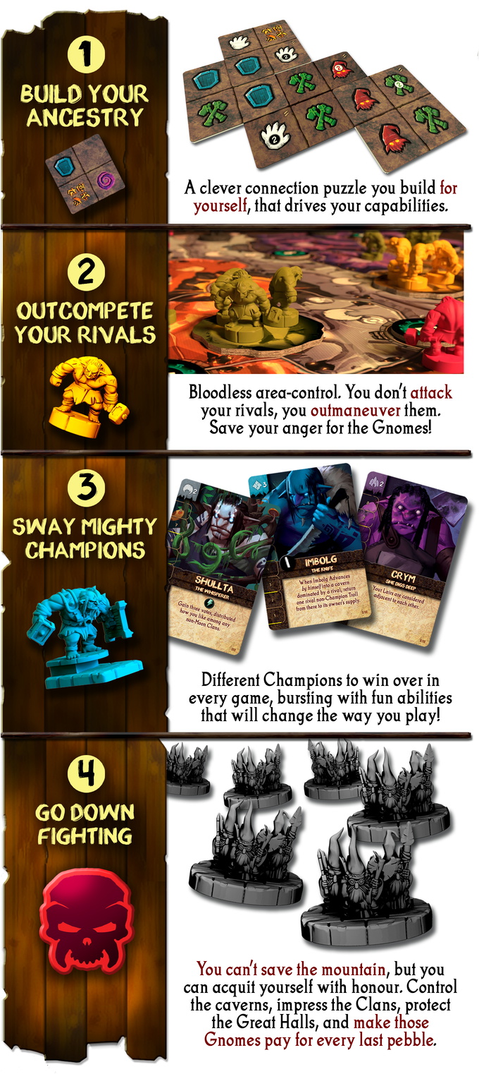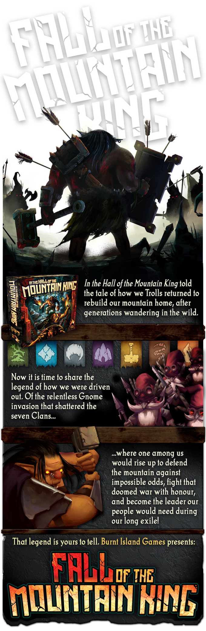 Fall of the Mountain King is a standalone prequel to In the Hall of The Mountain King, set during the catastrophic war that drove the trolls from their mountain kingdom generations ago. Build your ancestry to drive your actions in the caverns, win the loyalty of the clan Champions, and strive to be trolldom's greatest defender against the gnomish onslaught.