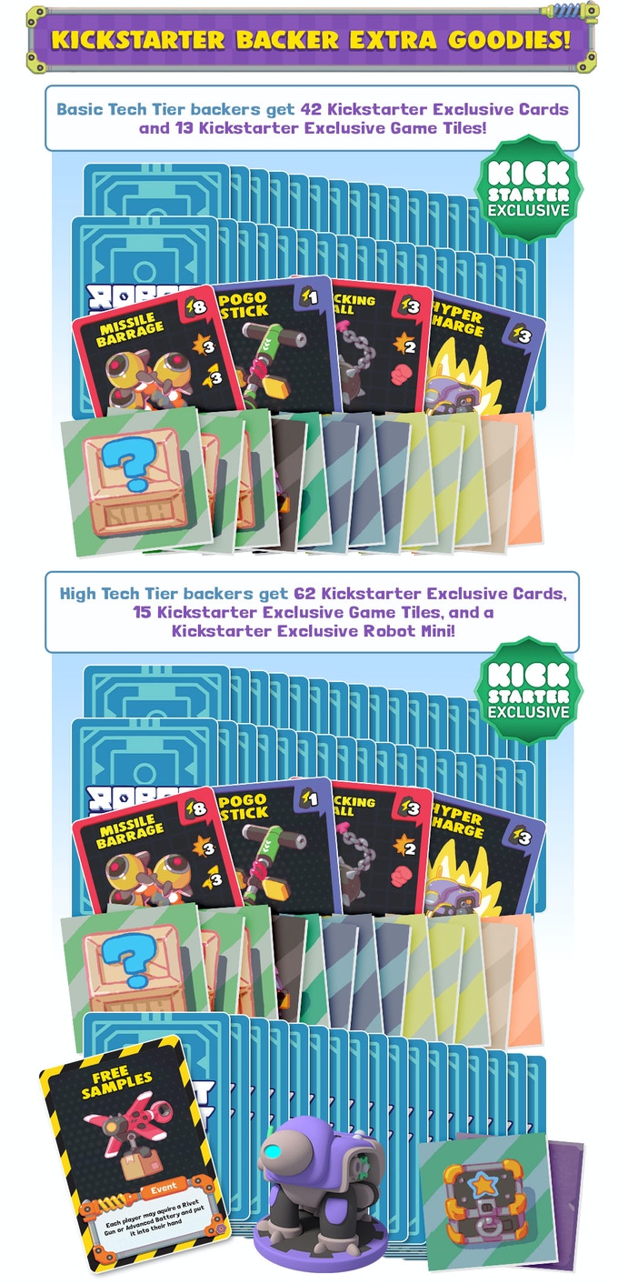 Your battery cards give you the energy to move, power your weapons, and buy powerful new cards for your deck. Navigate around the hazards of the arena, and blast your opponents to score points. Destroyed bots respawn each round, so you're never out of the action! Alliances are made and broken! The robot pilot with the most points at the end of the game wins!