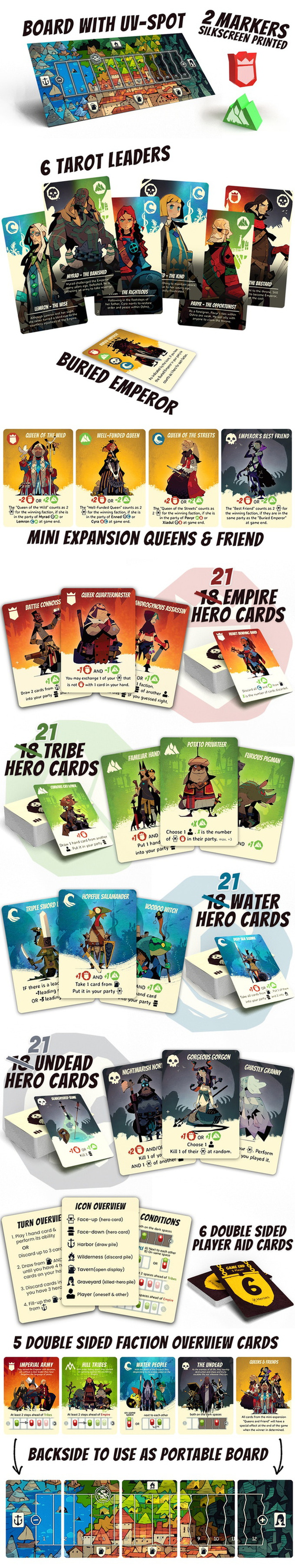 In Hidden Leaders, you take the role of one of six secret leaders, each of them is allied with two of the four factions/colors. By playing heroes into your tableau, either openly or secretly, you influence the outcome of the conflict.