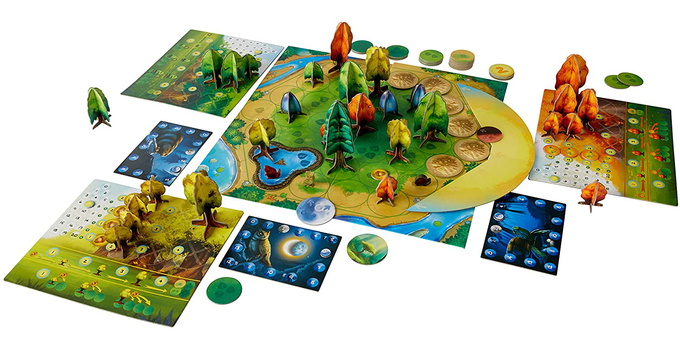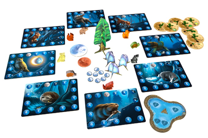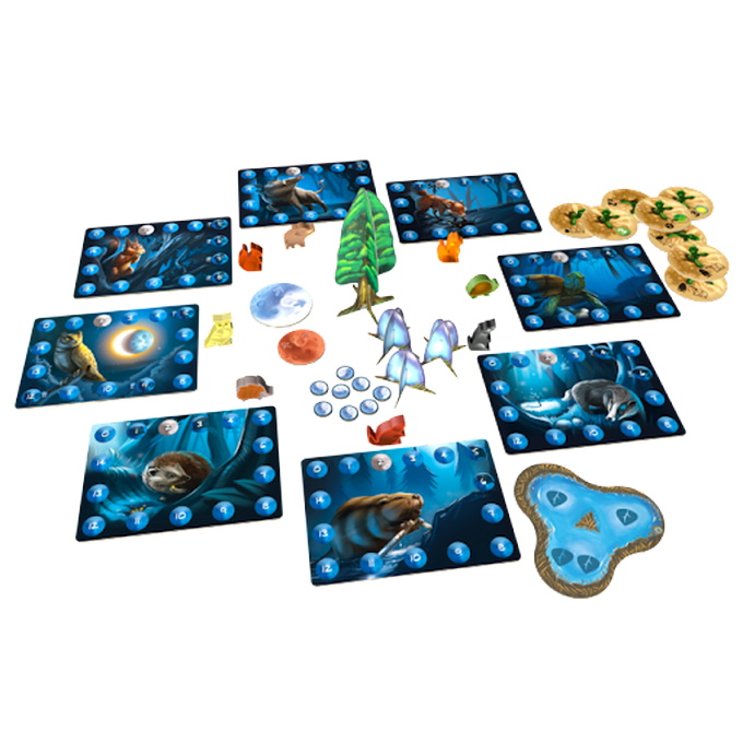 The moon turns in the opposite direction of the sun and casts its moonlight across the woods. Players collect lunar points for their new forest animal to activate special powers. Which one of the eight animals will be yours? The boar collects trees, the hedgehog plants seeds, the fox steals and moves seed around, and the owl turns lunar points into sun points.