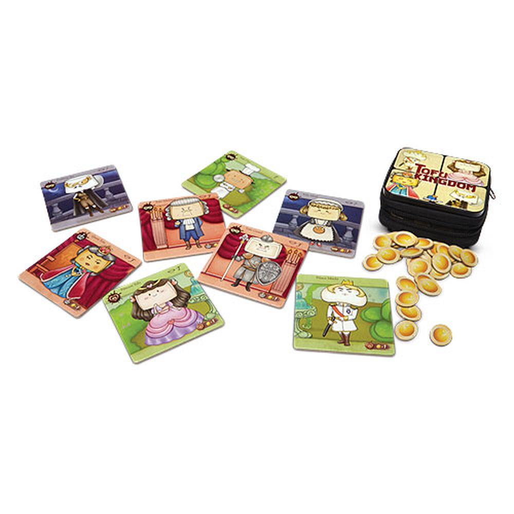 Tofu Kingdom, a.k.a. Princess Legend, is a deduction game involving seven characters. The player assuming the role of Prince Mochi asks each of the other players one question, then guesses which player plays the role of Princess Tofu, the love of Prince Mochi. When answering Prince Mochi's questions, the other players must either lie or tell the truth based on the cards they hold.