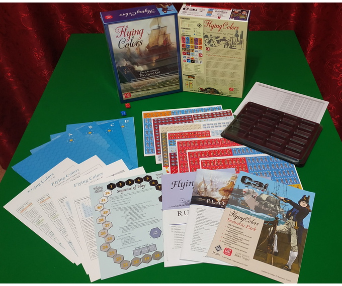 Flying Colors recreates naval actions during the height of the Age of Sail, from small engagements to full battles involving dozens of ships in each fleet. Play is fast, furious, and does not require the pre-plotted movement found in many other naval games. Instead, a simple initiative and command system allows players to activate and maneuver their fleets in a realistic manner, indicating how older commanders adhered to rules of engagement where more forward thinking commanders, like Nelson, could retain control of their fleets after the first broadsides began to be exchanged.