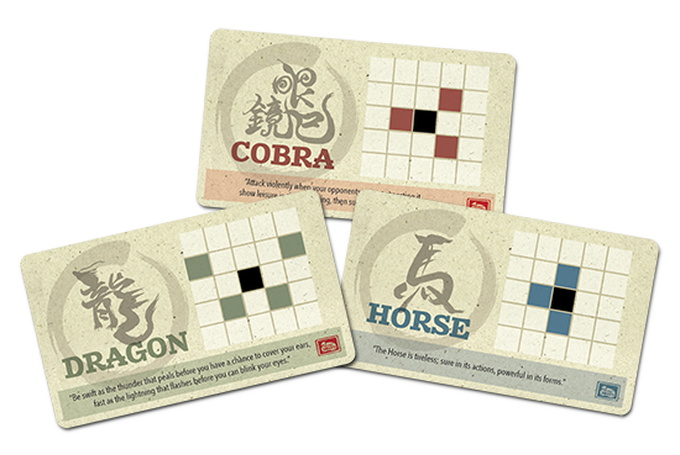 Each player has two open cards that each display a possible move for any of her pieces. There is a fifth card that cannot be used by either player. On a player's turn, she chooses one of her cards, moves one of her pieces according to the chosen card, then replaces the card she used with the fifth card. The other player then chooses one of his cards, moves accordingly, and exchanges that card with this fifth card — which is, of course, the card the first player just used.
