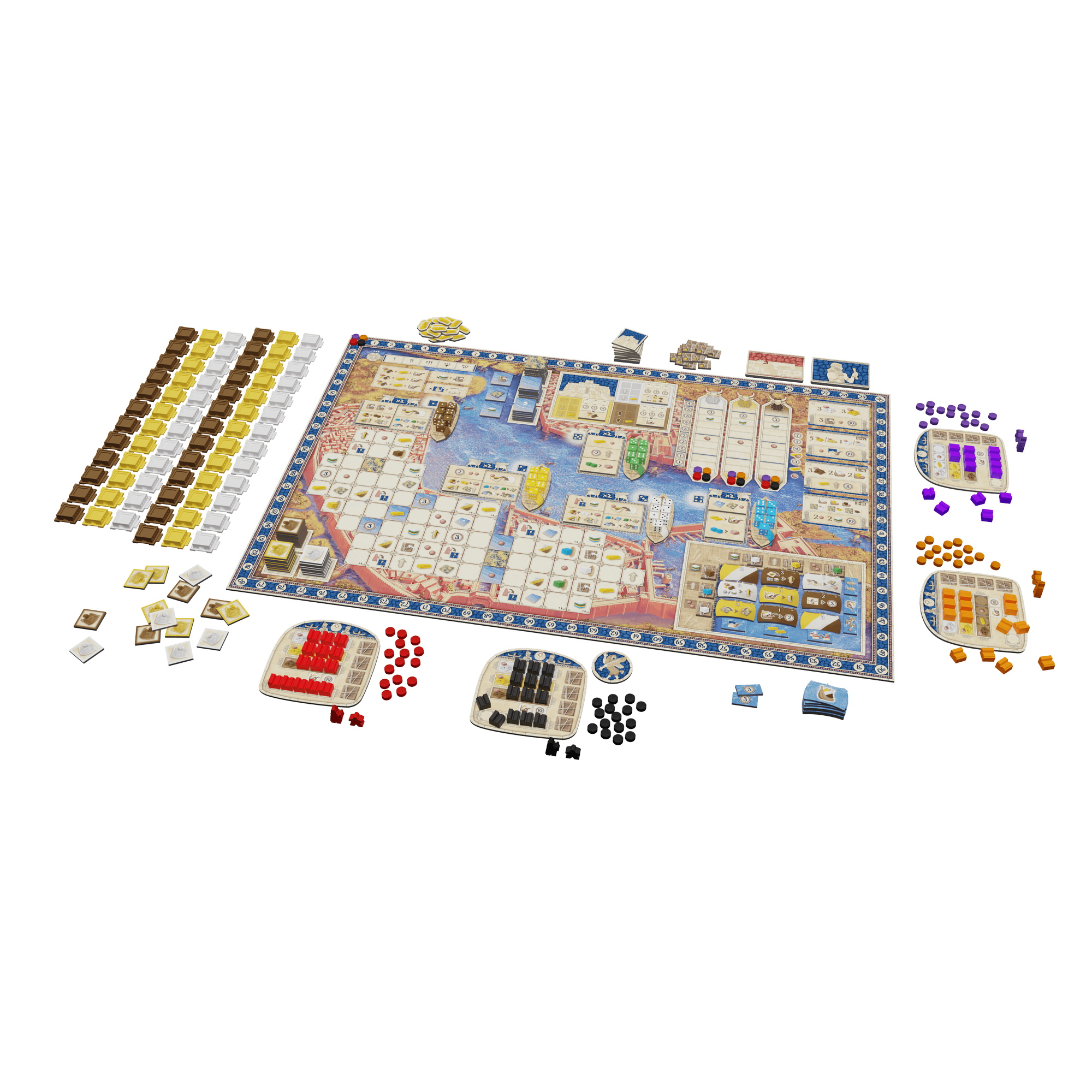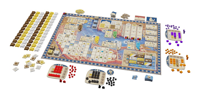 Through various actions you will be able to expand your influence in the various districts, expanding construction sites and turning them into buildings to score valuable victory points. But you will also exert your influence in the temple district in order to earn the king's favor. In the port district you can obtain ships with important abilities and for scoring victory points.