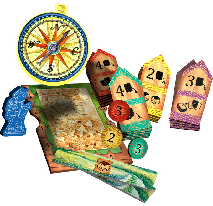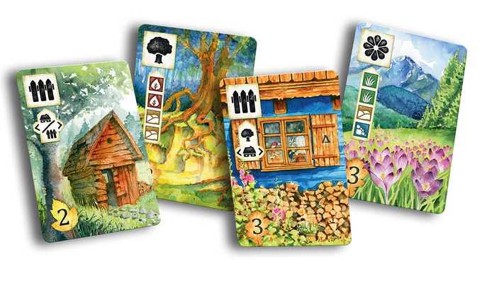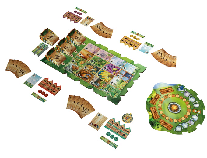 In this medium-weight board game for 1-4 players, you take turns placing path tokens on one of the two boards. Placing a token on the main board allows the player to get cards, but playing them requires meeting certain requirements. Playing a token on the bonfire board activates special actions (which helps to implement a chosen strategy) and gives the opportunity to achieve goals that provide additional points. Throughout the game, players collect cards in their meadow and surroundings area. At the end, the player with the most points on cards and on the bonfire board wins.