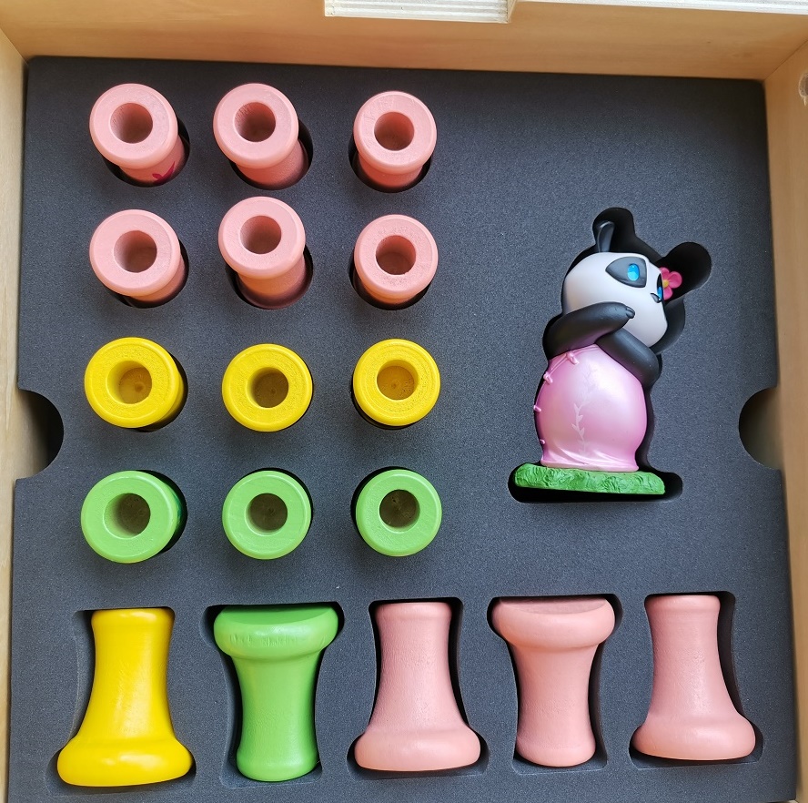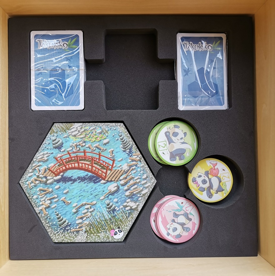 In Takenoko, the players will cultivate land plots, irrigate them, and grow one of the three species of bamboo (Green, Yellow, and Pink) with the help of the Imperial gardener to maintain this bamboo garden. They will have to bear with the immoderate hunger of this sacred animal for the juicy and tender bamboo. The player who manages his land plots best, growing the most bamboo while feeding the delicate appetite of the panda, will win the game.