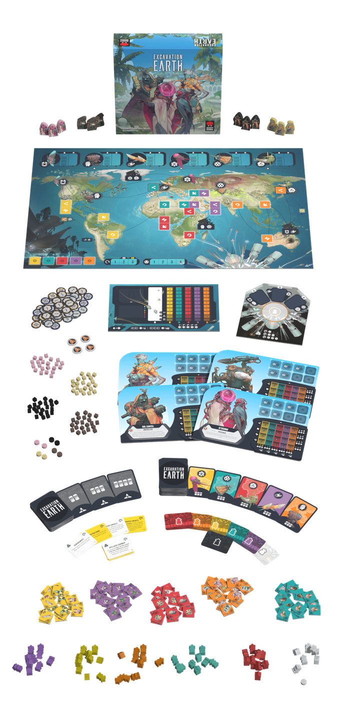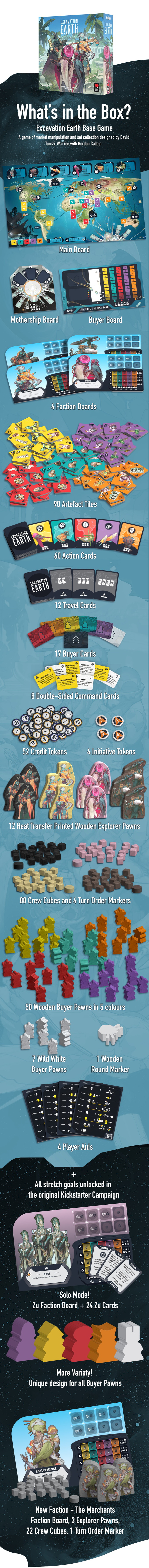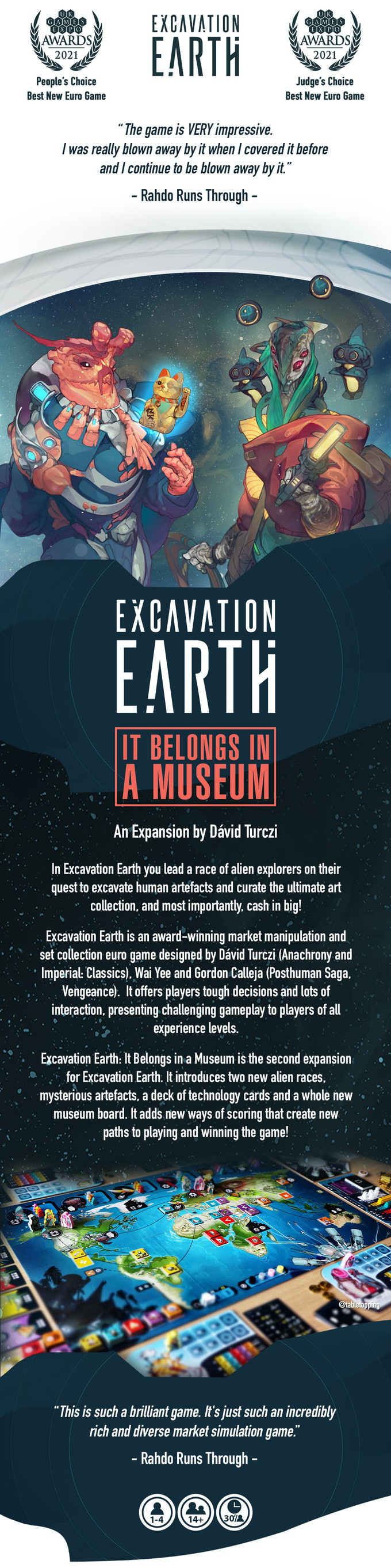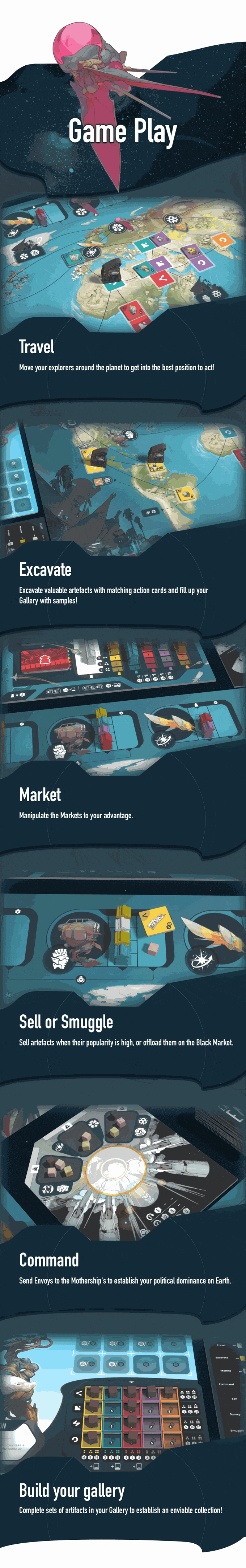 The artifacts you dig up can be either sold to the bazaars housed on one of the aliens' ships that landed on Earth or added to a collection that will be sold off as a coherent art collection to museums back home. Excavation Earth ends after three rounds and the player who makes the most money during the game wins.