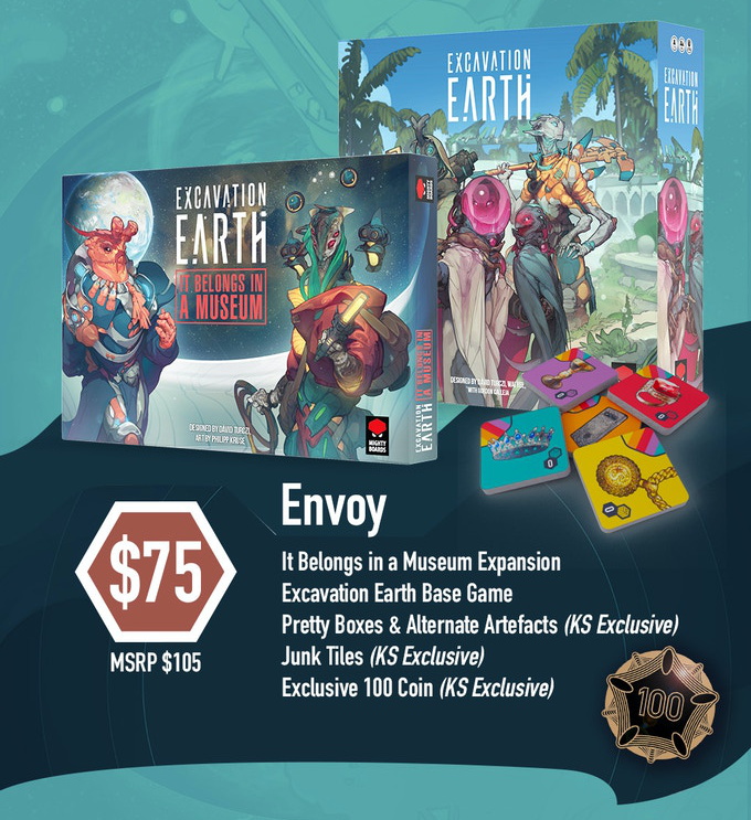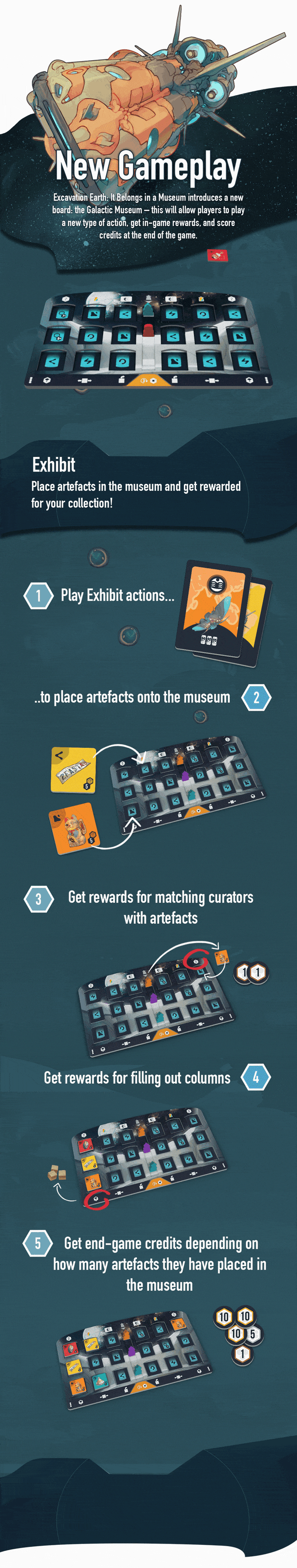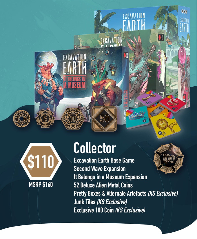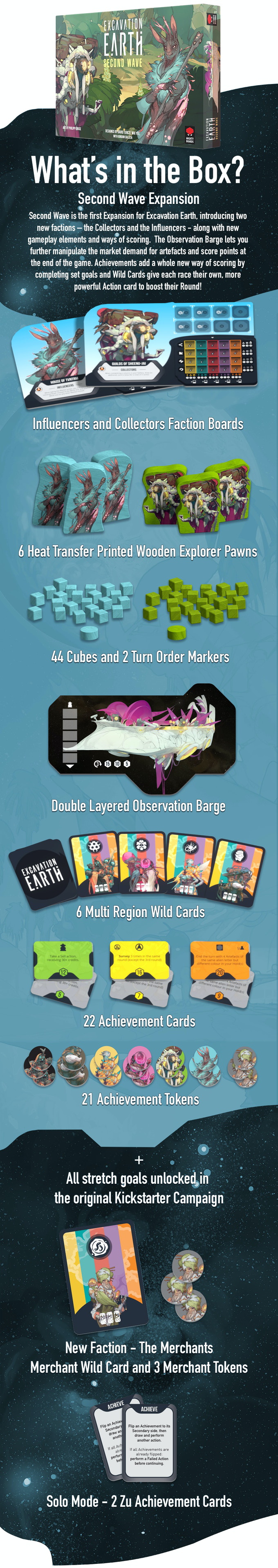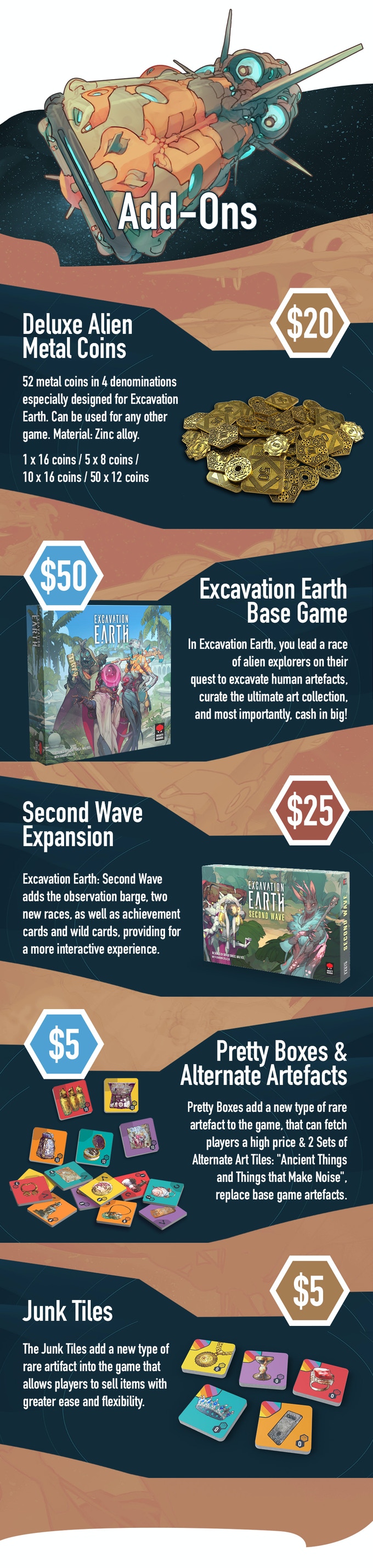 The artifacts you dig up can be either sold to the bazaars housed on one of the aliens' ships that landed on Earth or added to a collection that will be sold off as a coherent art collection to museums back home. Excavation Earth ends after three rounds and the player who makes the most money during the game wins.