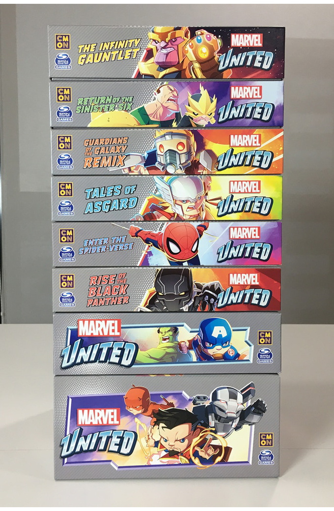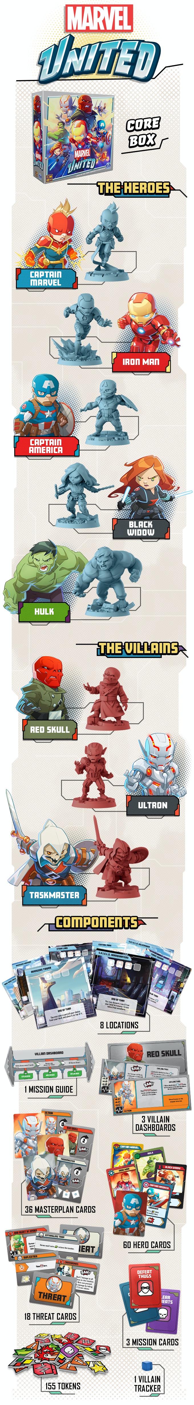 In Marvel United you take the role of iconic Marvel Heroes cooperating to stop the master plan of a powerful Villain controlled by the game. Each Villain unveils their unique master plan, with cards that trigger different effects, and threats that pose challenges across the locations. Heroes must choose carefully the cards to play from their unique decks, that not only offer different actions and superpowers to use, but also combine with the actions of other Heroes to do the impossible. Build your storyline, unite your powers, save the day!
