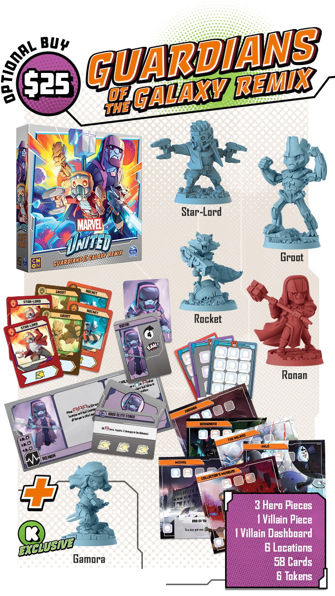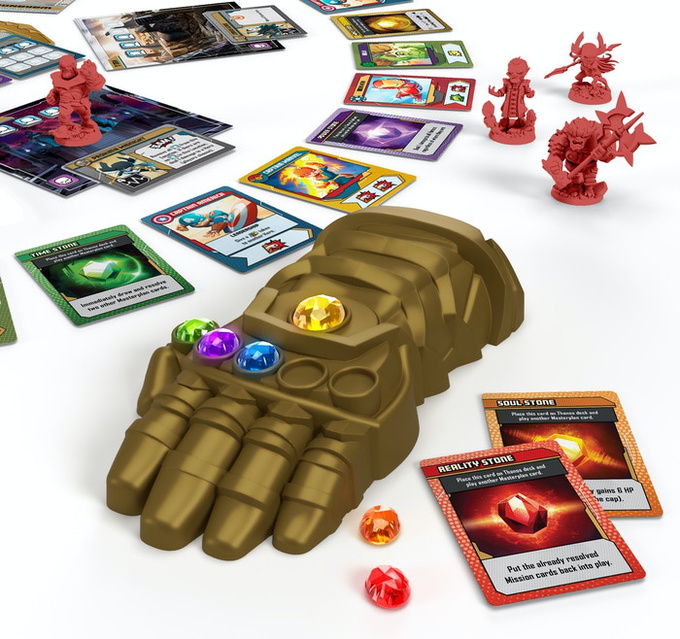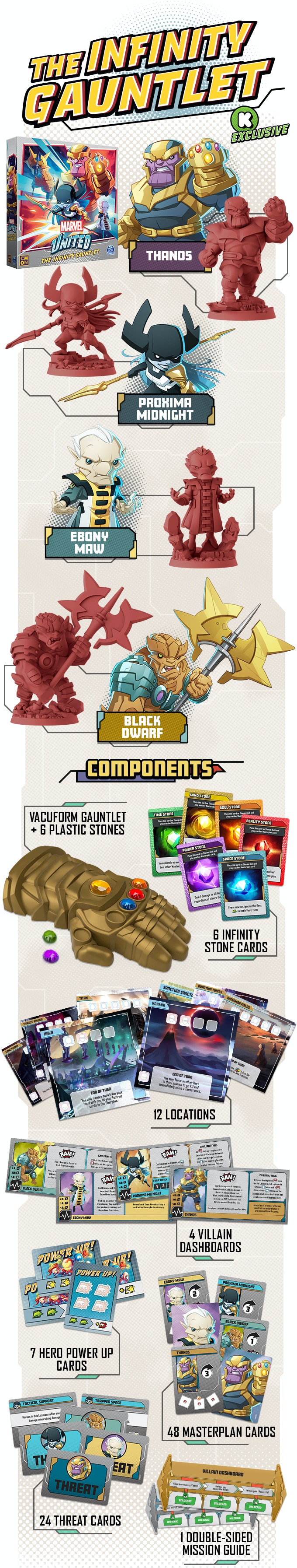 The Infinity Gauntlet adds an epic game mode to Marvel United. Embark on a sequence of up to four games in the struggle to first keep the Children of Thanos from gathering all Infinity Stones, then battle against Thanos himself. Over the course of the first three games, try to defeat the Children of Thanos as quickly as possible to prevent too many Infinity Stones from falling into their master's hands, all the while sparing some effort to unlock power-ups that may be decisive in the final confrontation.